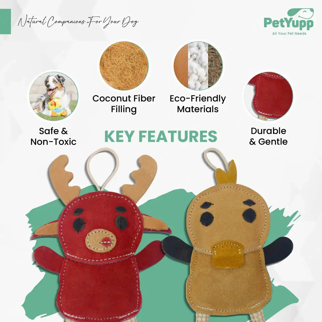 Add the Leather, Cotton & Jute Toy with Coconut Fiber Filling - Pack of 2 (Plucky Ducky & Lucy Moosy) to your dog’s collection for twice the fun, comfort, and eco-friendly goodness!