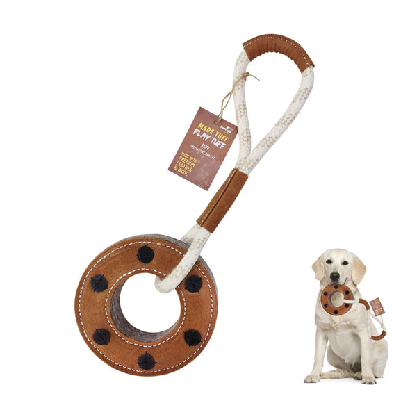 Our Natural Extra Tuff Toss & Chew Dog Toy - Ring, a premium choice for pet owners who prioritize quality and safety. Handmade with natural suede leather and wool, this durable toy is perfect for teething puppies and aggressive chewers of all sizes. Designed for interactive play, it's ideal for games of tug-of-war, providing hours of fun and mental stimulation for your furry friend. Non-toxic and pet-safe, this leather dog toy ensures your pet's well-being while satisfying their natural chewing instincts. Invest in a toy that combines craftsmanship, durability, and safety with PetYupp