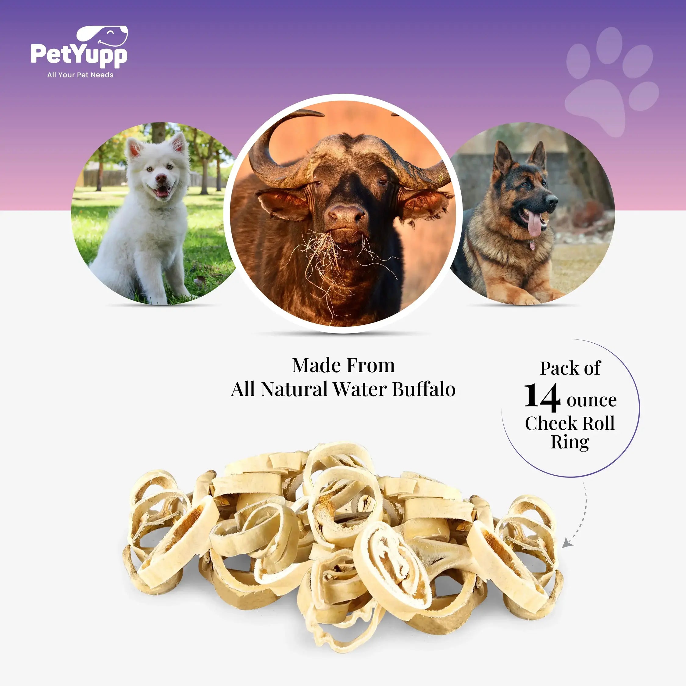 100% Natural Water Buffalo Cheek Roll Ring Dog Chew - Pack of 14 oz