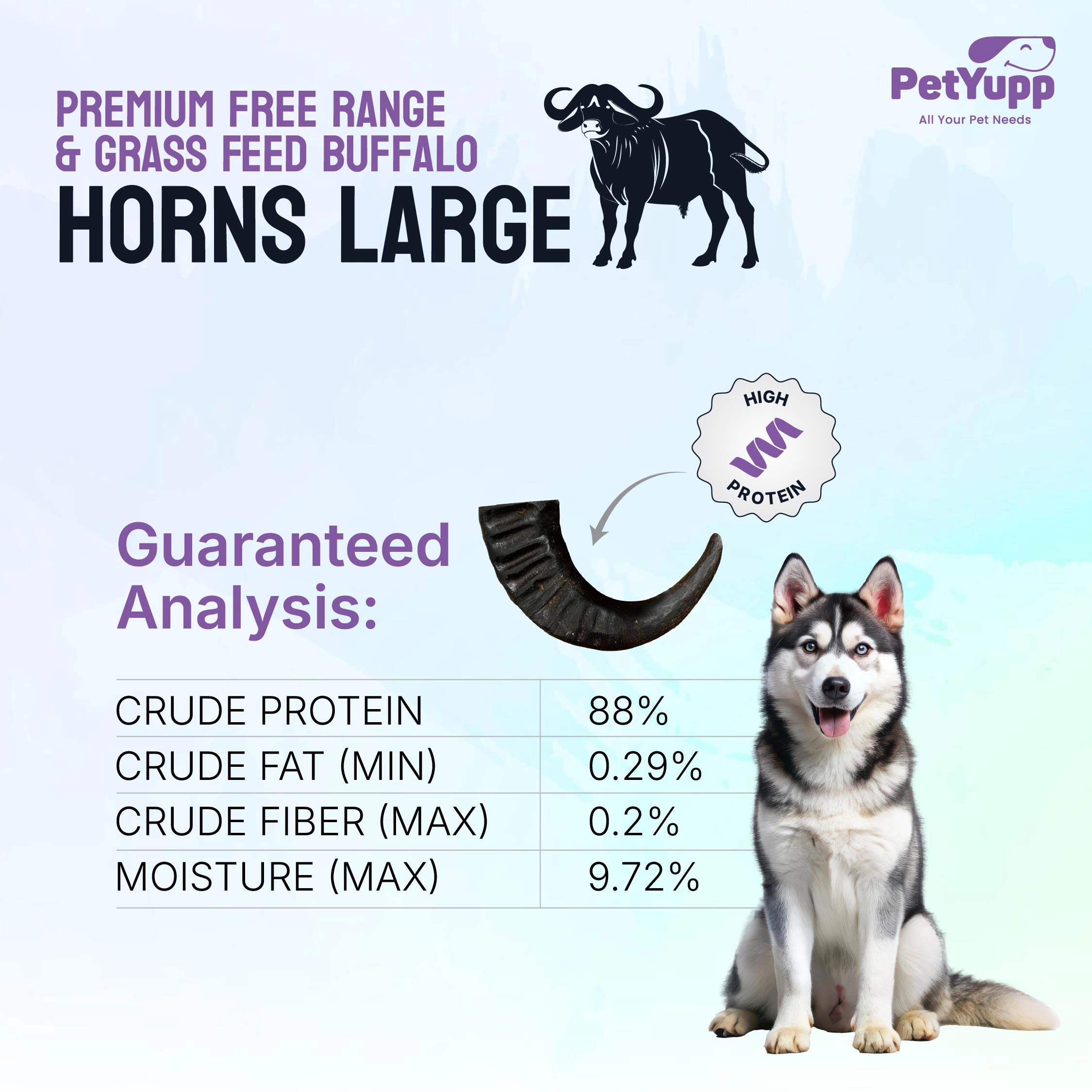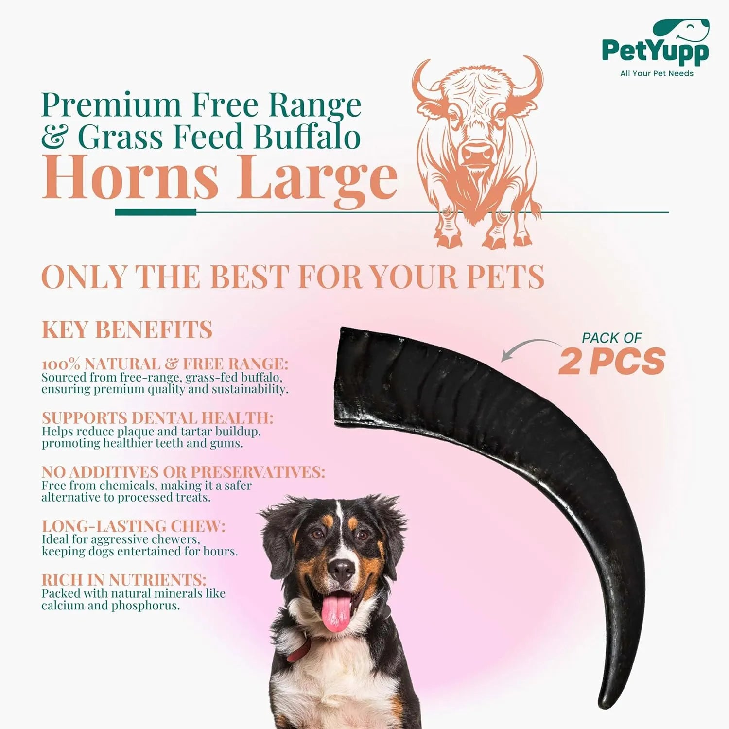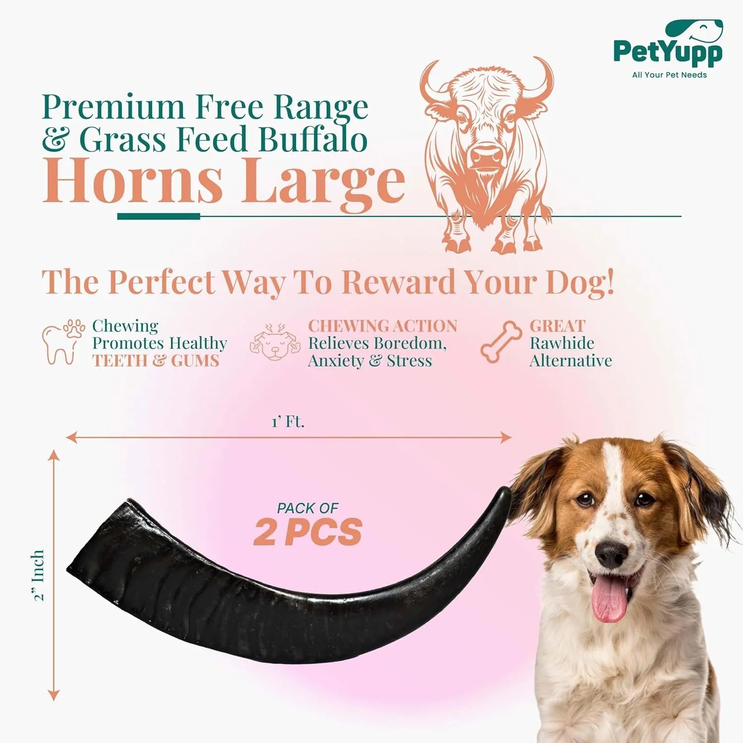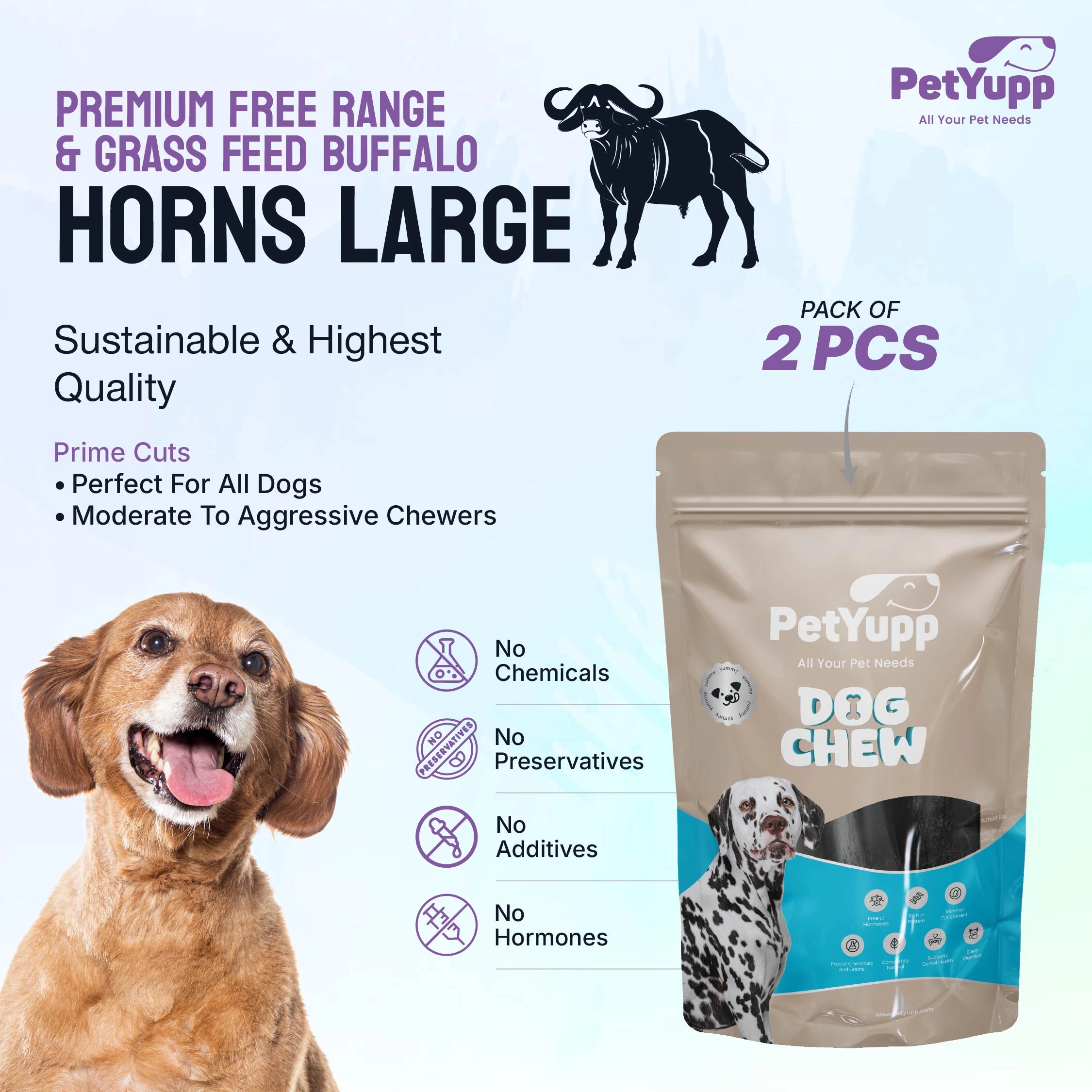 Discover the Perfect Chew for Your Furry Friend with PetYupp Water Buffalo Horns! Give your dog a natural, long-lasting treat they’ll love. PetYupp Water Buffalo Horns are naturally sourced from grass-fed, free-range water buffalo, ensuring a safe, chemical-free chewing experience for your pet. Unlike synthetic or rawhide alternatives, our buffalo horns provide a safer, healthier option that’s both affordable and durable. Designed for all dog breeds and sizes—from playful puppies to heavy chewers—these horns cater to your dog's unique needs. Their natural texture promotes dental health by reducing plaque and tartar buildup while keeping your dog engaged and stress-free. With every chew, your pet gains essential minerals like calcium and phosphorus, supporting their overall well-being. Each ethically sourced horn is free from additives, preservatives, and odors, making it a perfect choice for health-conscious pet owners. Available in Small (pack of 4), Medium (pack of 3), and Large (pack of 2), there’s a size for every dog in your household. Whether it’s solo chewing, teething relief, interactive play, or training, Our Water Buffalo Horns are the versatile solution to keep your dog entertained and healthy. Choose PetYupp—because your dog deserves the best!